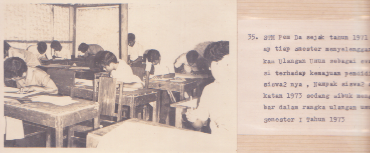 | Siswa sedang mengerjakan Ulangan Umum Menggambar tahun 1971 Jurusan yang pertama dibuka adalah Jurusan Bangunan |