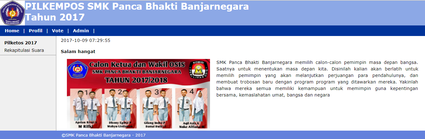 Tanggal 09 Oktober 2017, Senin Panitia PKO (Pemilihan Ketua Osis) SMK Panca Bhakti Banjarnegara melaksanakan pemilihan ketua Osis secara Online.