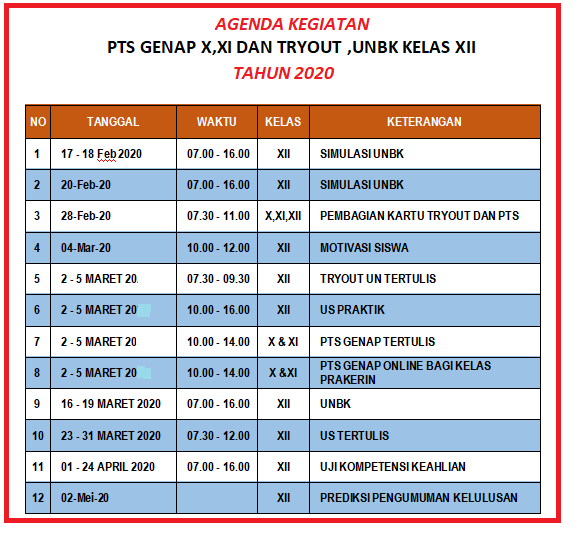 Kegiatan Bulan Pebruari pertengahan berkaitan dengan yang berkaitan dengan ujian nasional telah berlangsung. Agenda awal adalah gladi bersih (17 – 18 Februari 2020).
